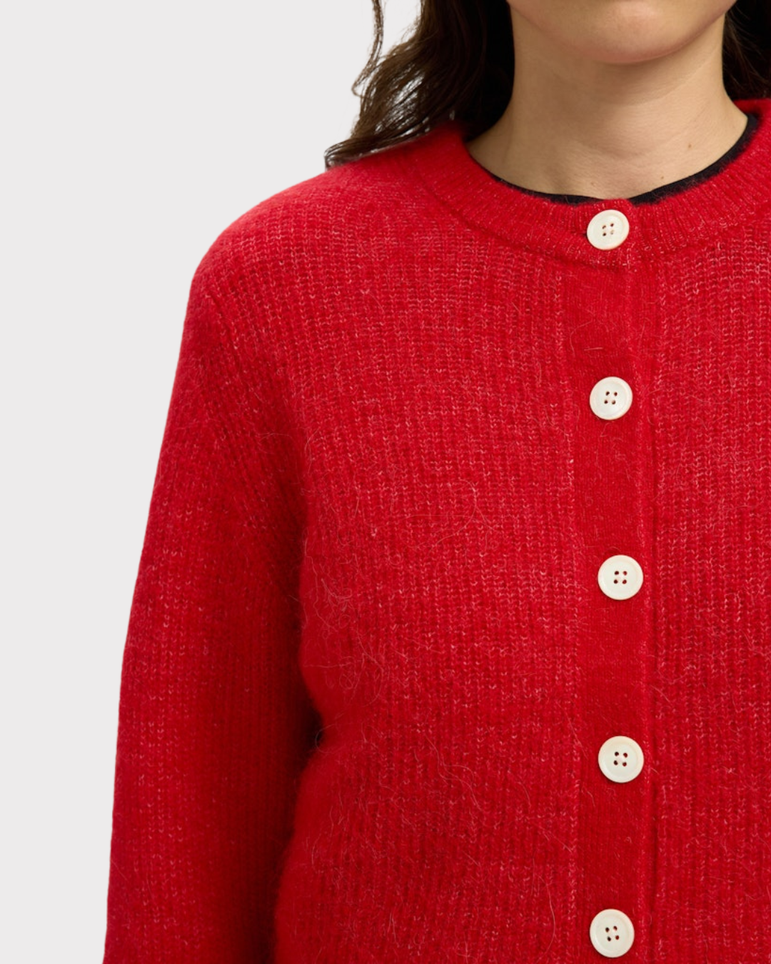 Cardigan med rund hals og lange ermer. Den har droppede skuldre som gir et avslappet uttrykk, samt ribbestrikkede mansjetter som tilfører en klassisk detalj. Passformen er regular fit, som gjør den behagelig og allsidig i bruk.