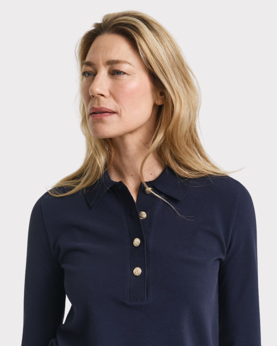 En stilren og komfortabel langermet polo skjorte laget med en liten piqué-struktur. Den har en klassisk polo krage og er designet for en regular fit. Skjorten er detaljert med merkede gullfargede shank-knapper, sidesplitter og GANT-logo brodert på ermet.
