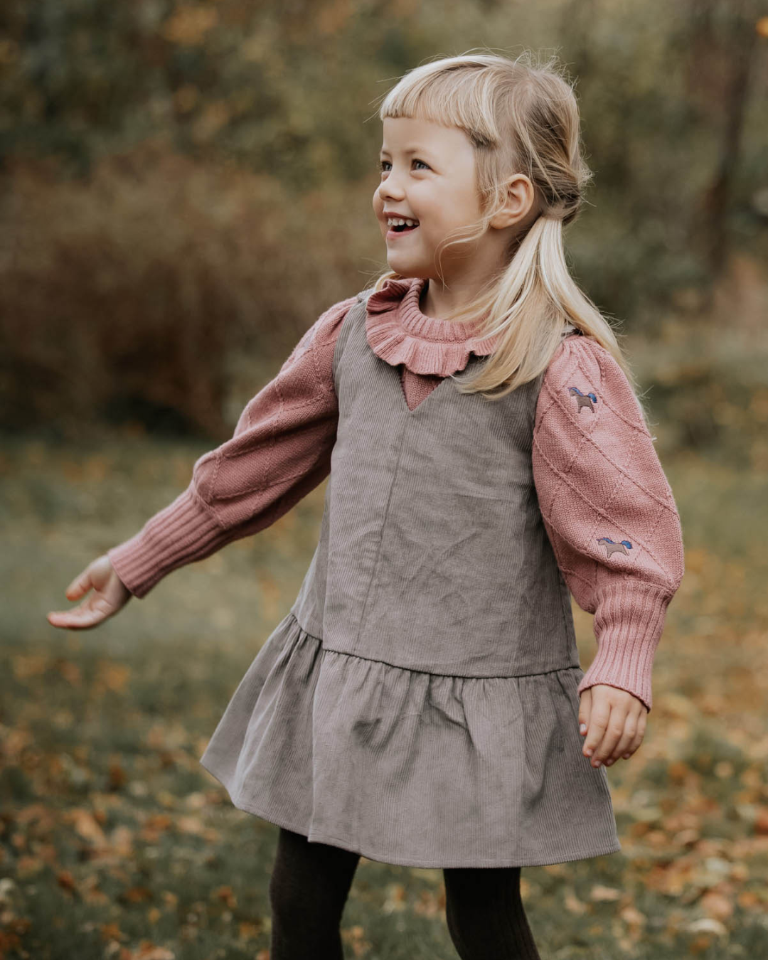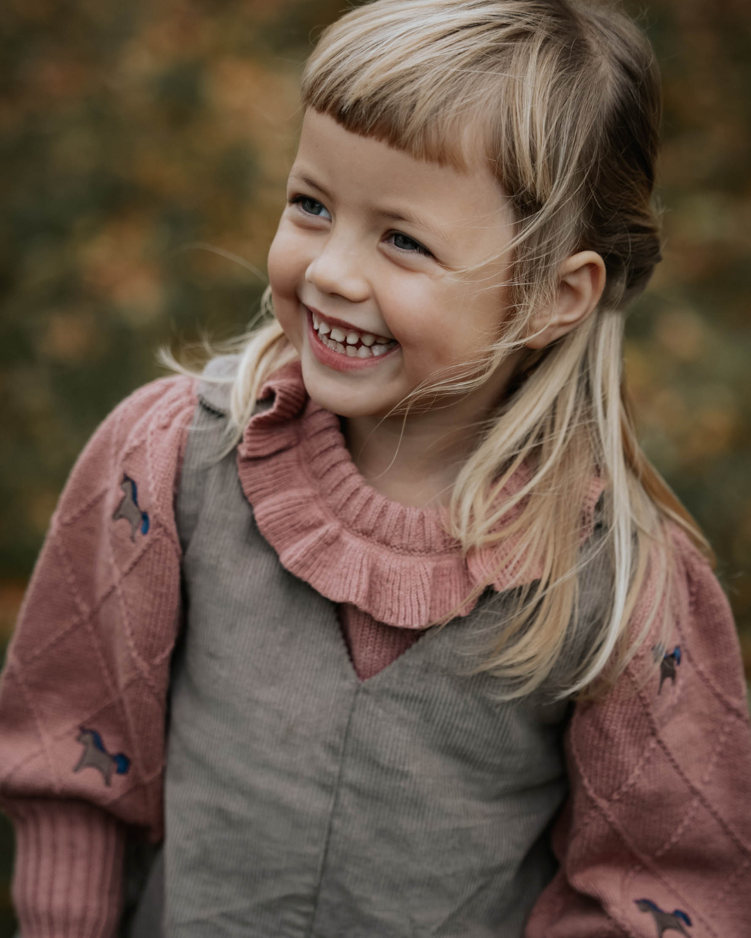 Strikket genser med ruffle-detaljer ved kragen og enhjørningsbroderi