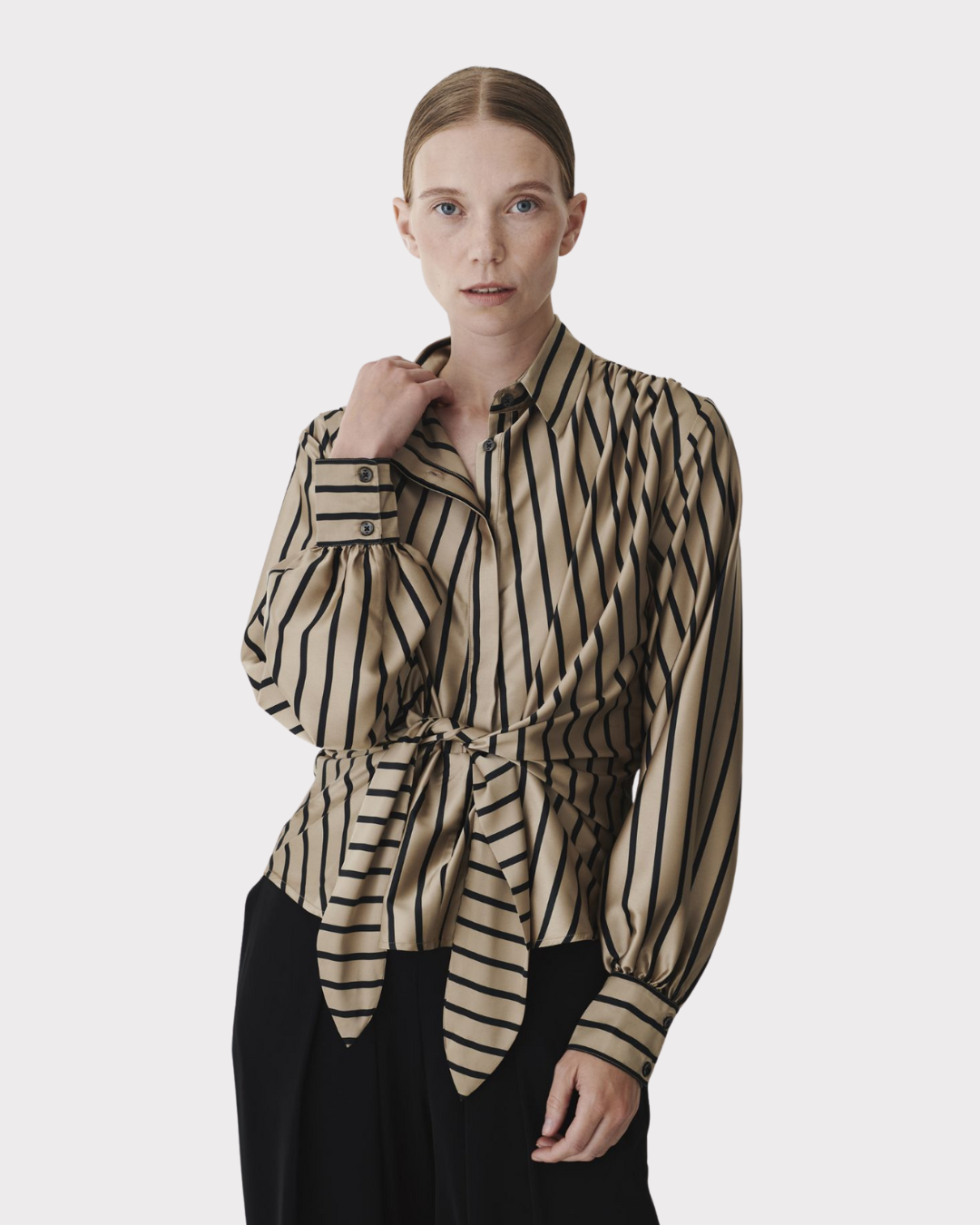 Lee-skjorten har en elegant knytebåndslukking foran for å fremheve midjen. Skjorten har lange ermer, en klassisk krage og knappelukkinger foran og på ermene.