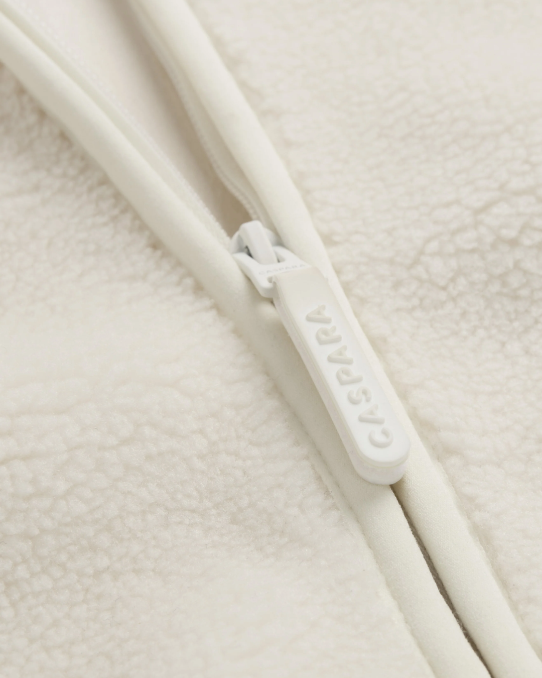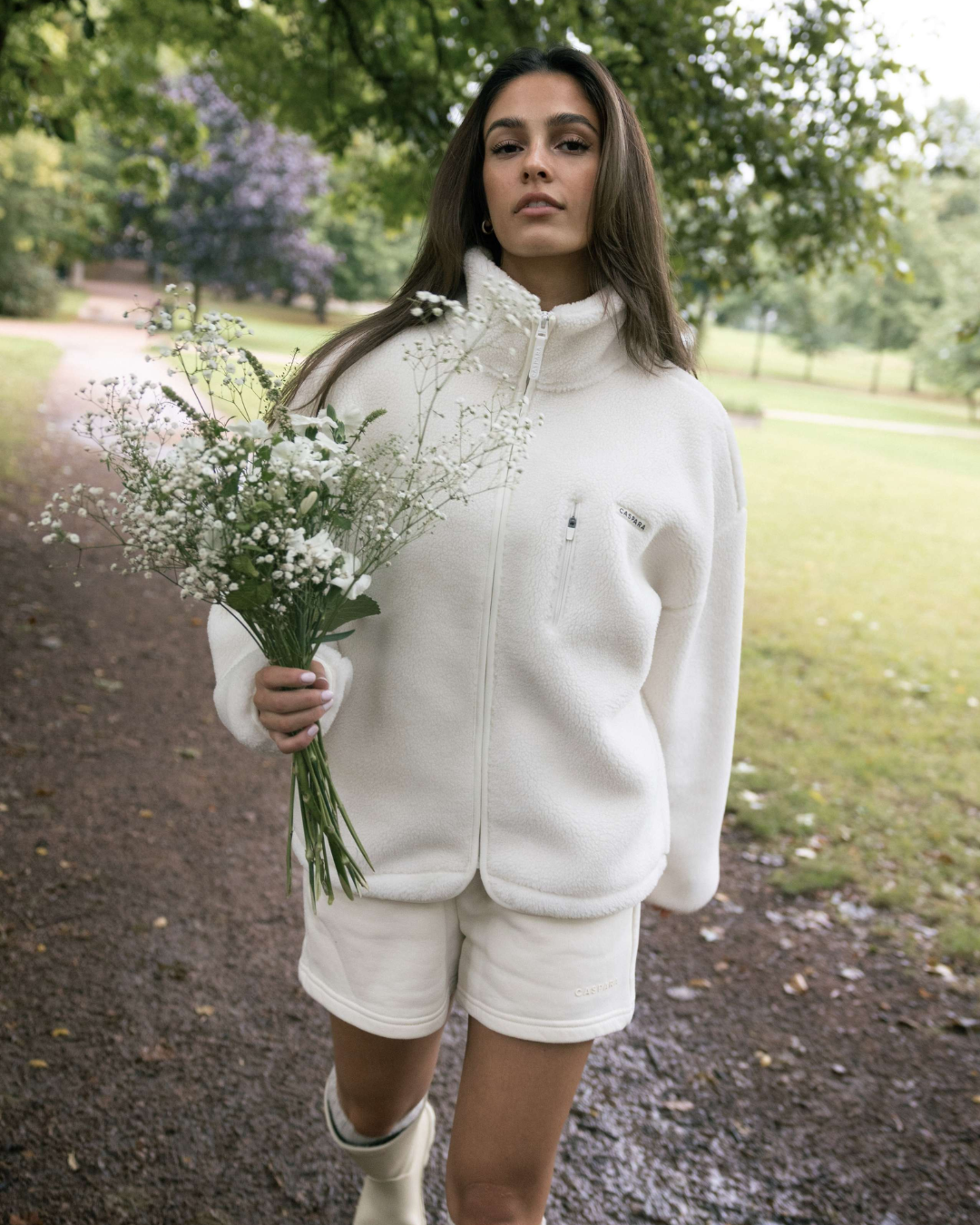Teddyjakke med en oversized passform, nedfelte skuldre og en høy ståkrage som gir en avslappet silhuett og maksimal komfort.