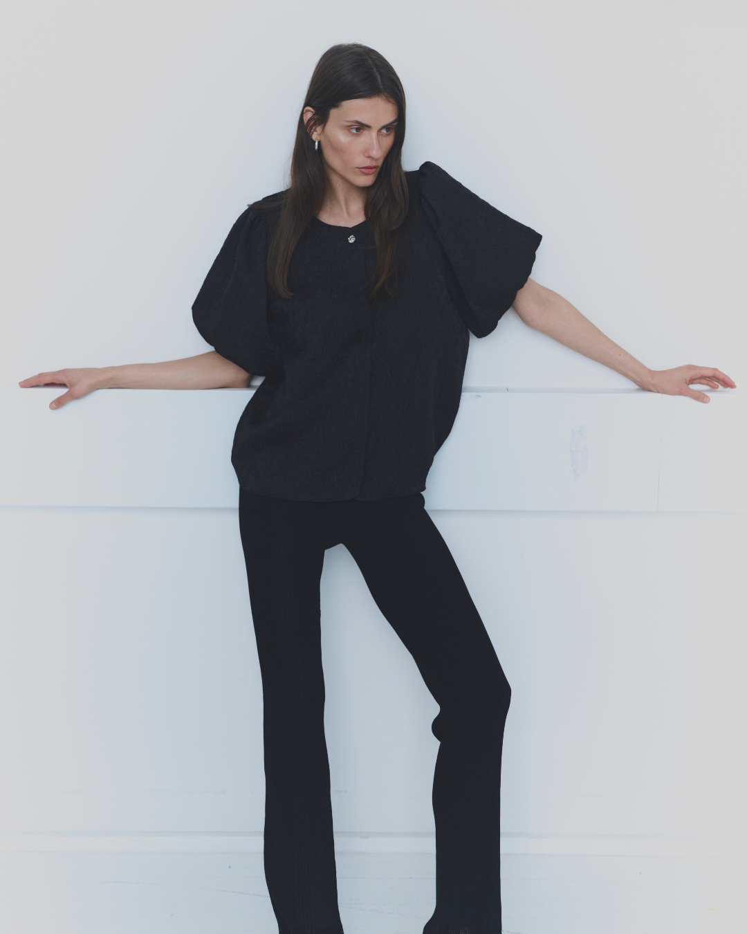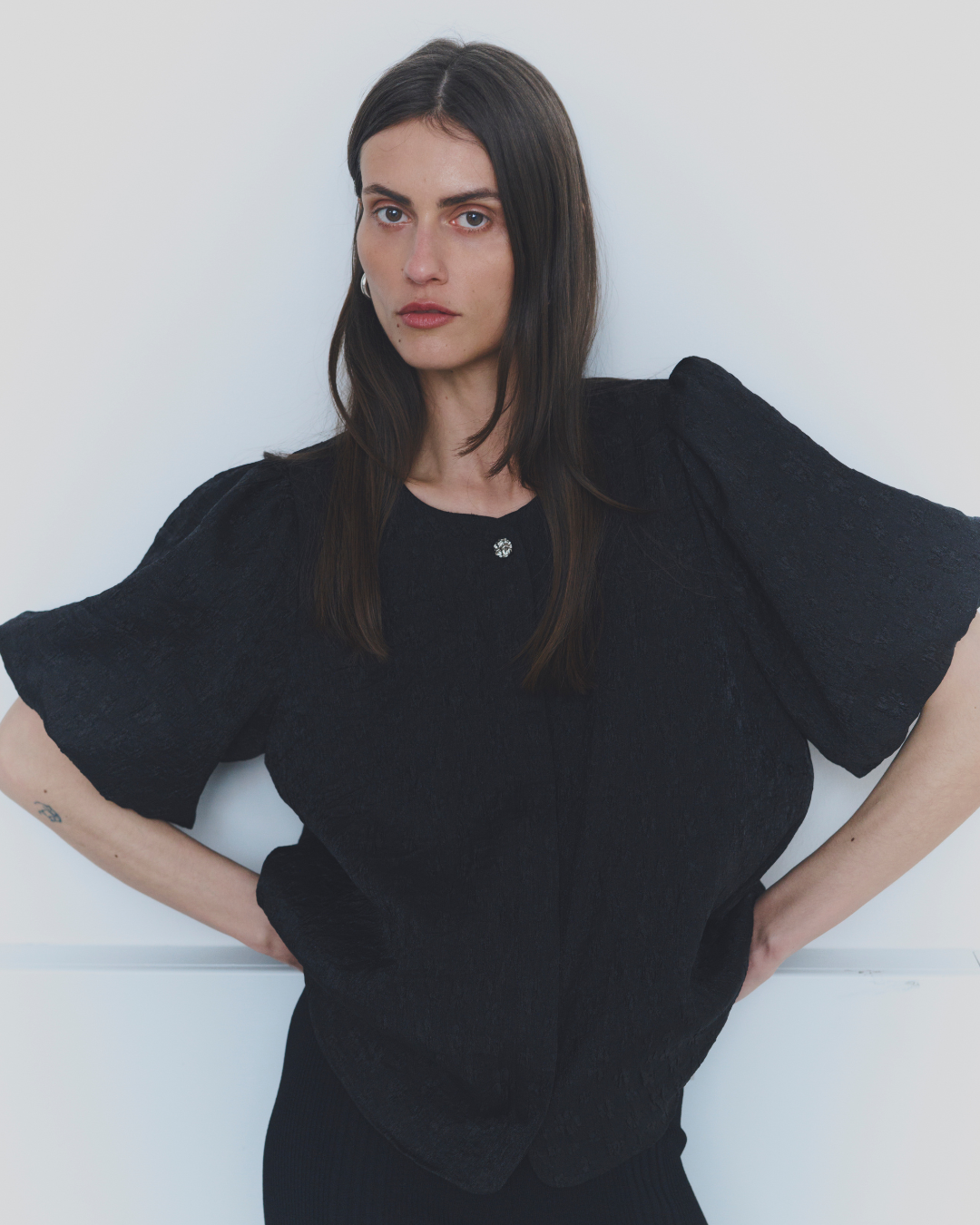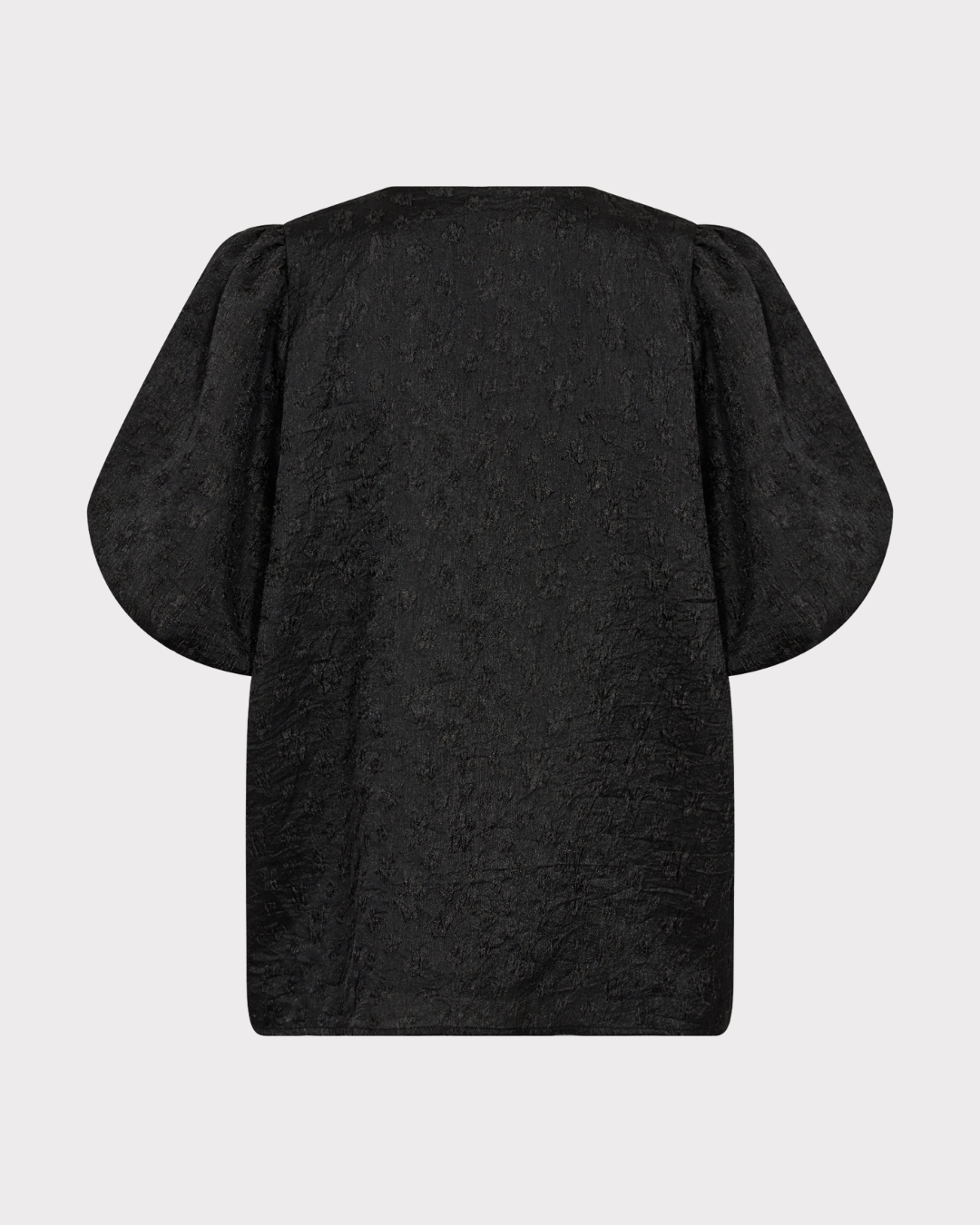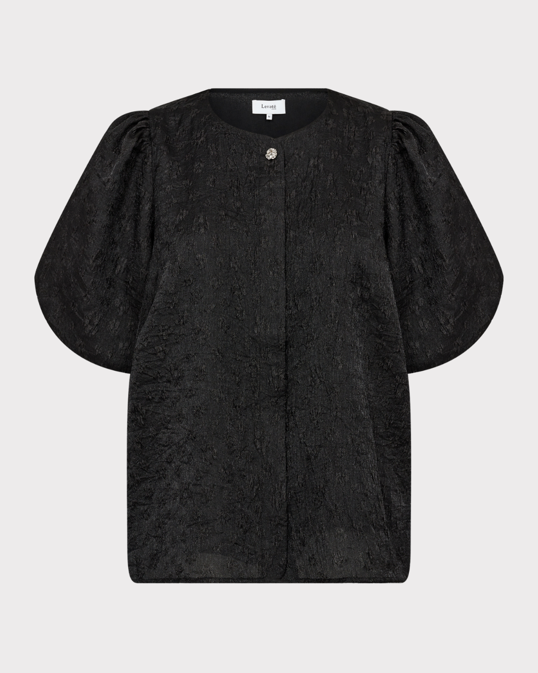 Bluse med rund halsutringning, en elegant knappelukking foran og puffede korte ermer i et teksturert stoff.