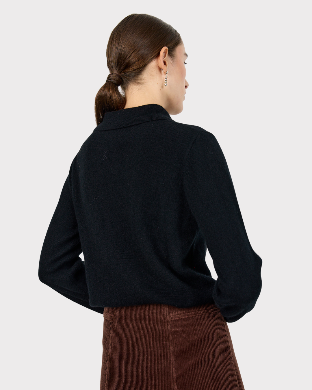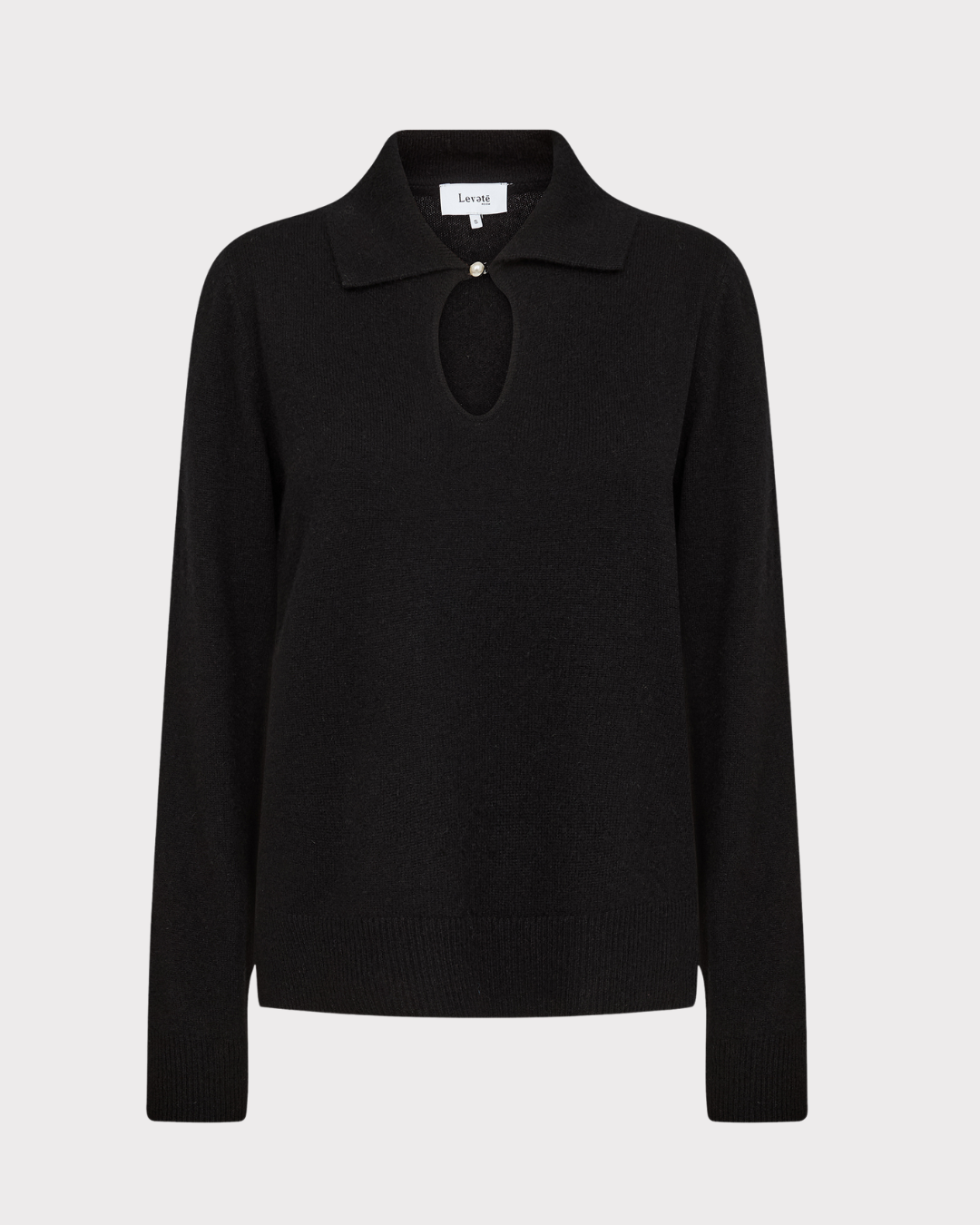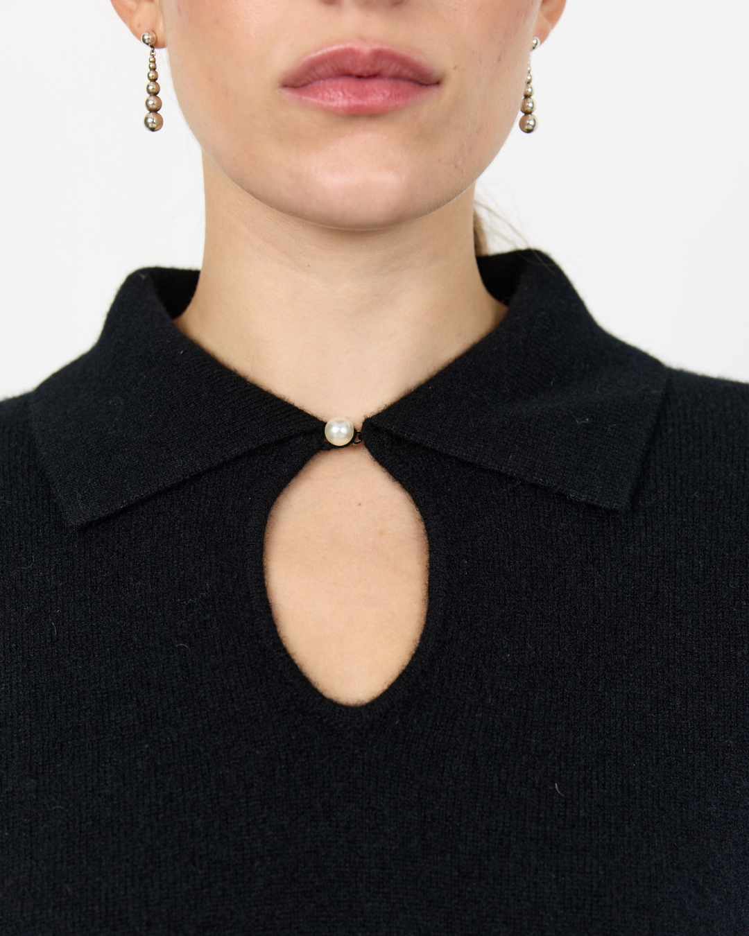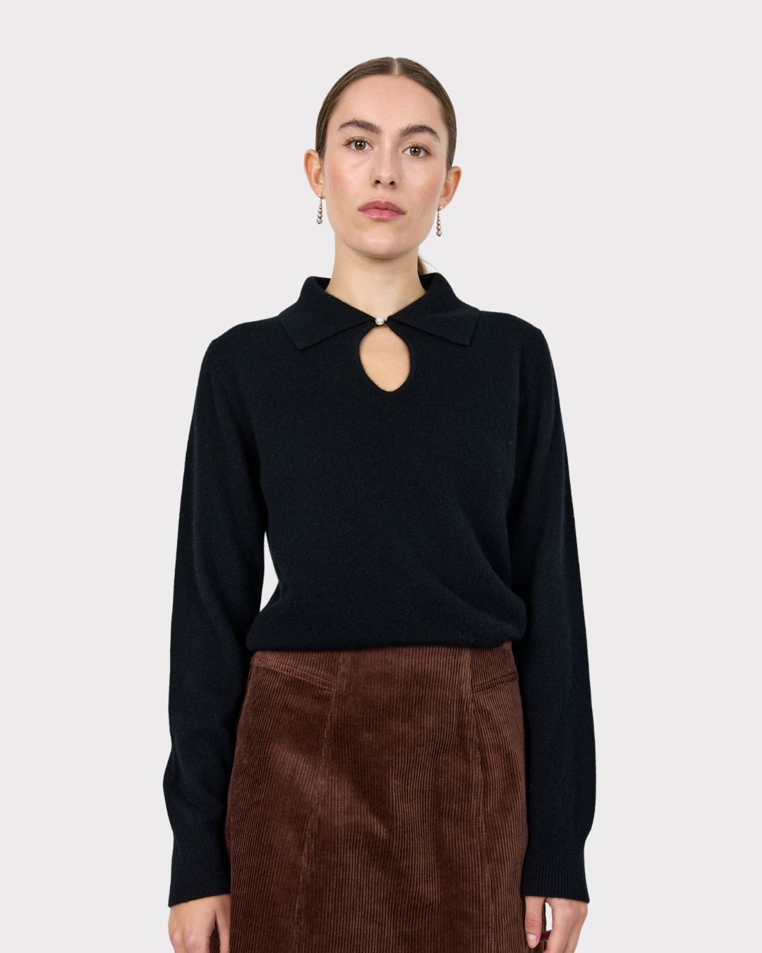 Denne genseren har en unik nøkkelhullsdetalj med perleknappelukking i kragen, lange ermer og ribbestrikkede kanter.