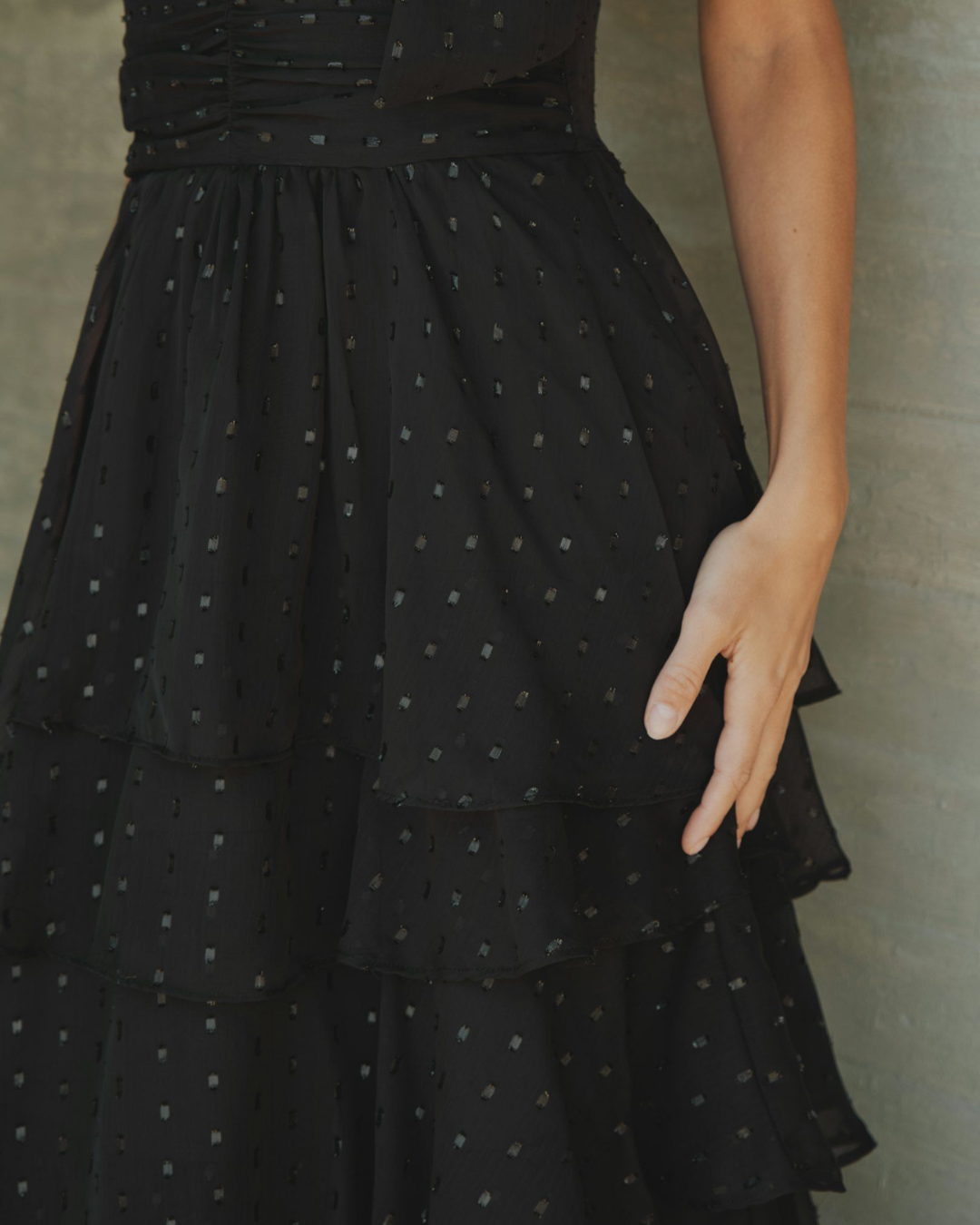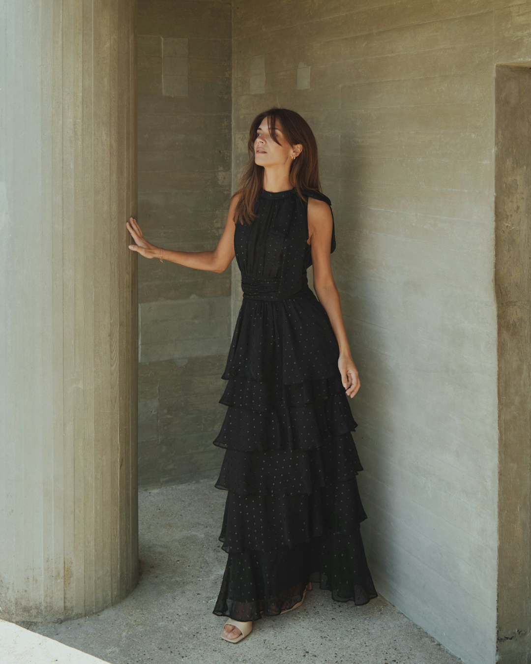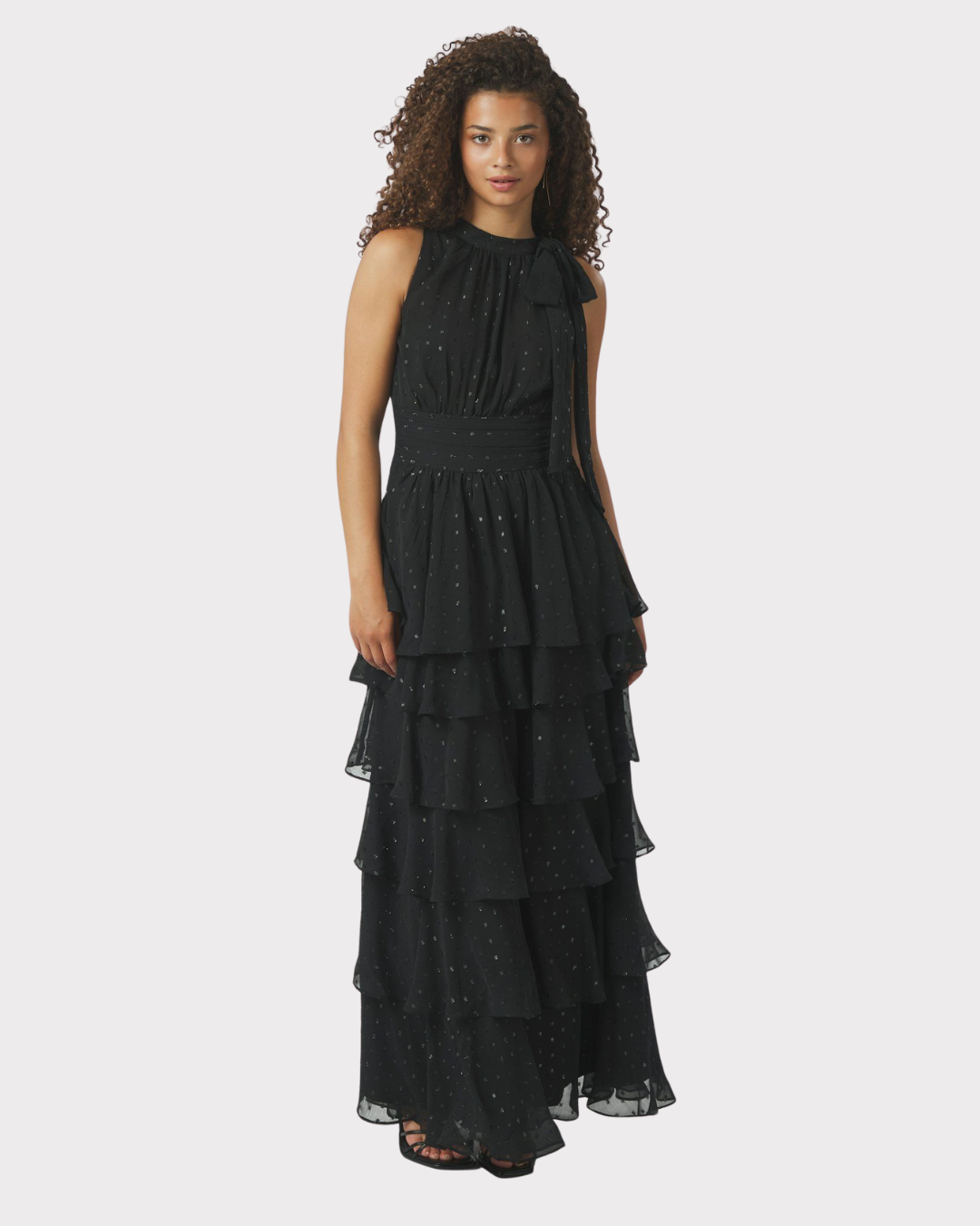 Fin lang kjole med halterneck og sløyfebånd ved utringningen. Kommer i en fin chiffon-kvalitet. Modellen er 176 cm høy og bruker størrelse 36.