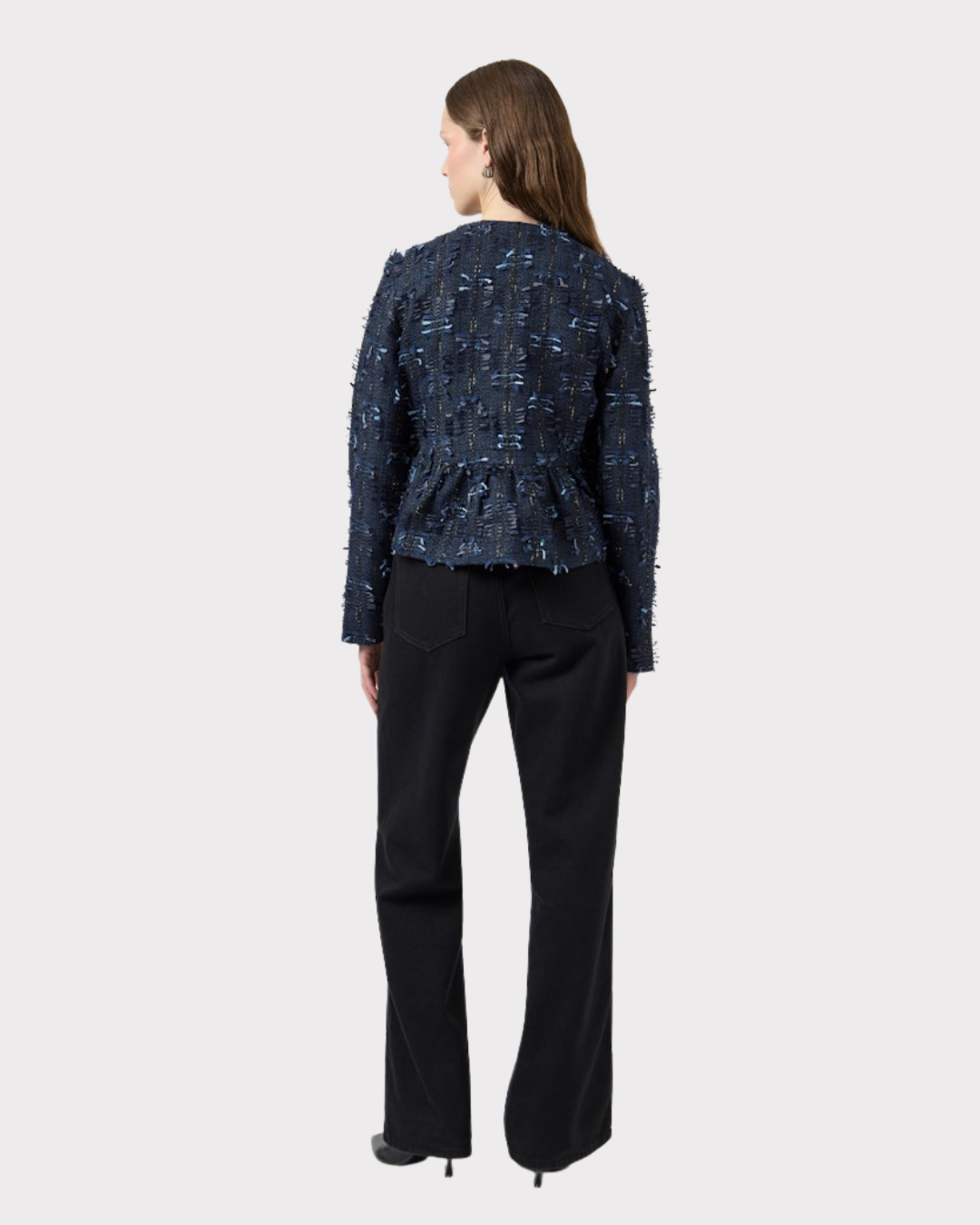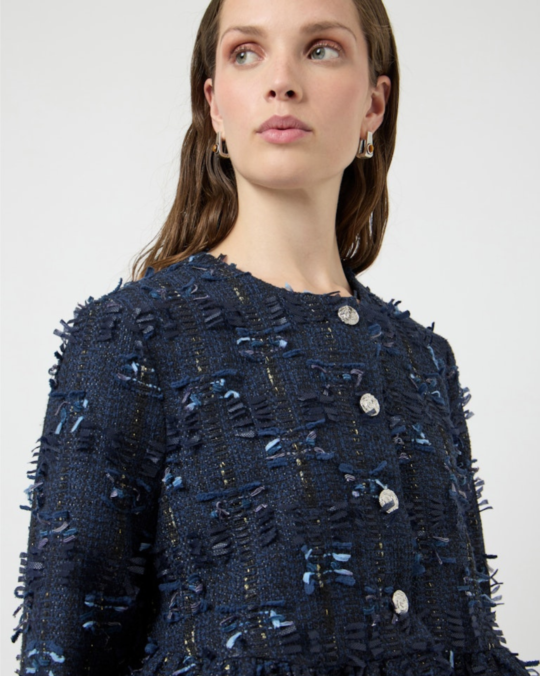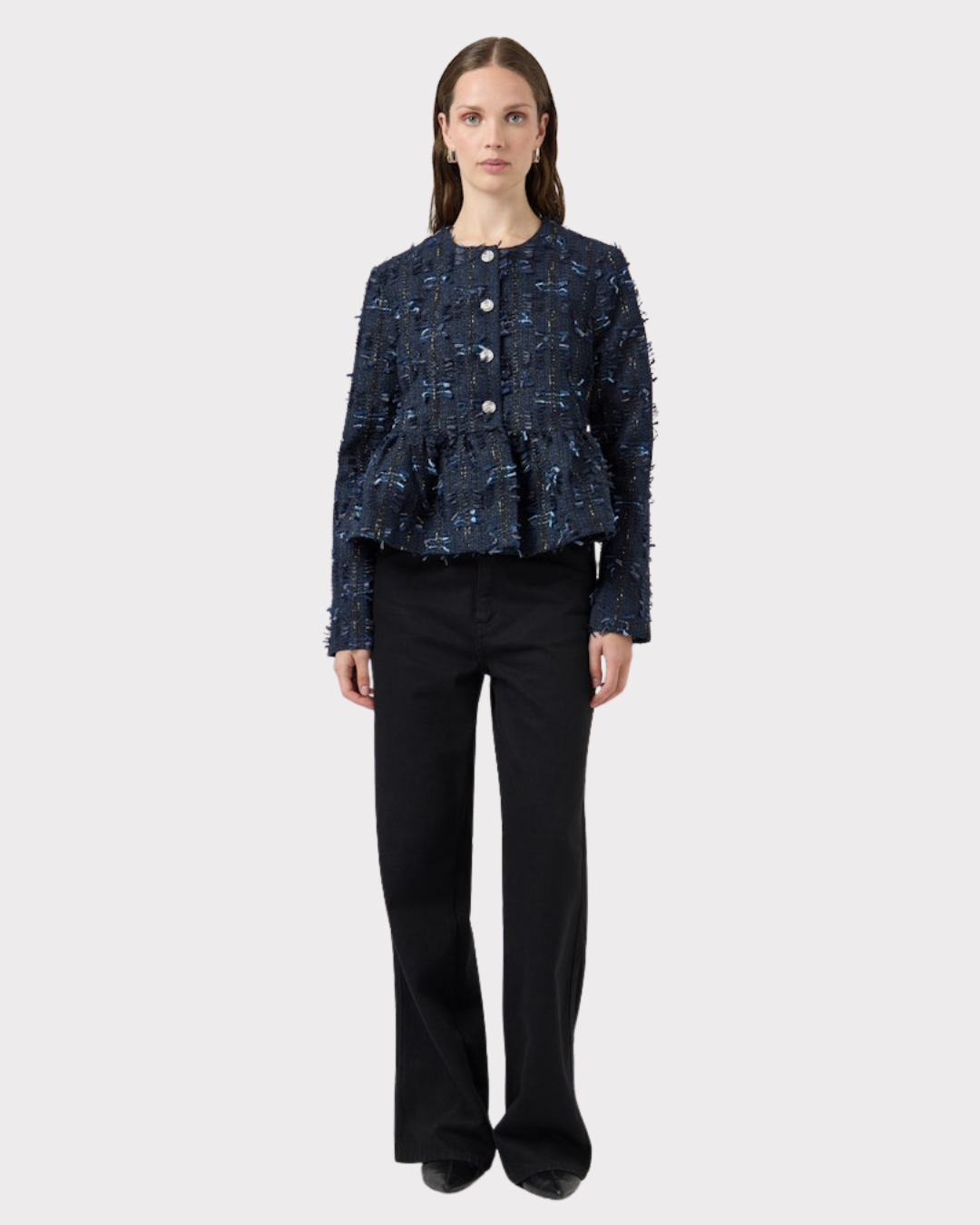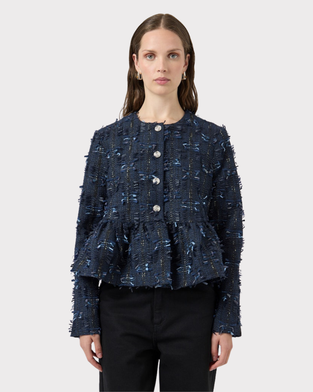 Jakke med rund hals, lange ermer og knappelukking foran. Passformen er kort, noe som gir et moderne og allsidig uttrykk.