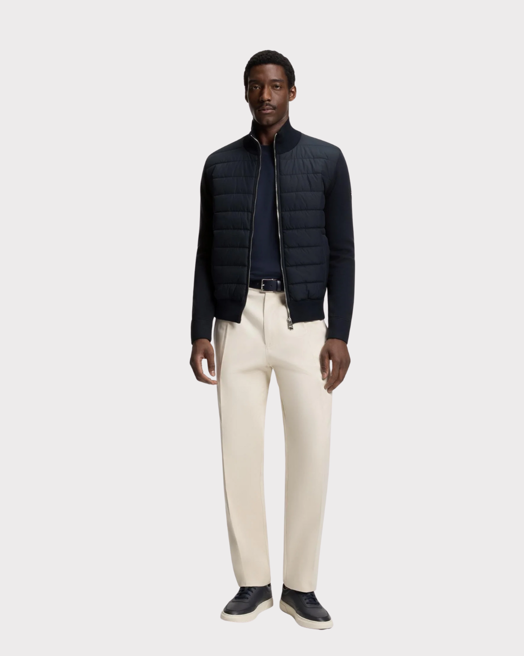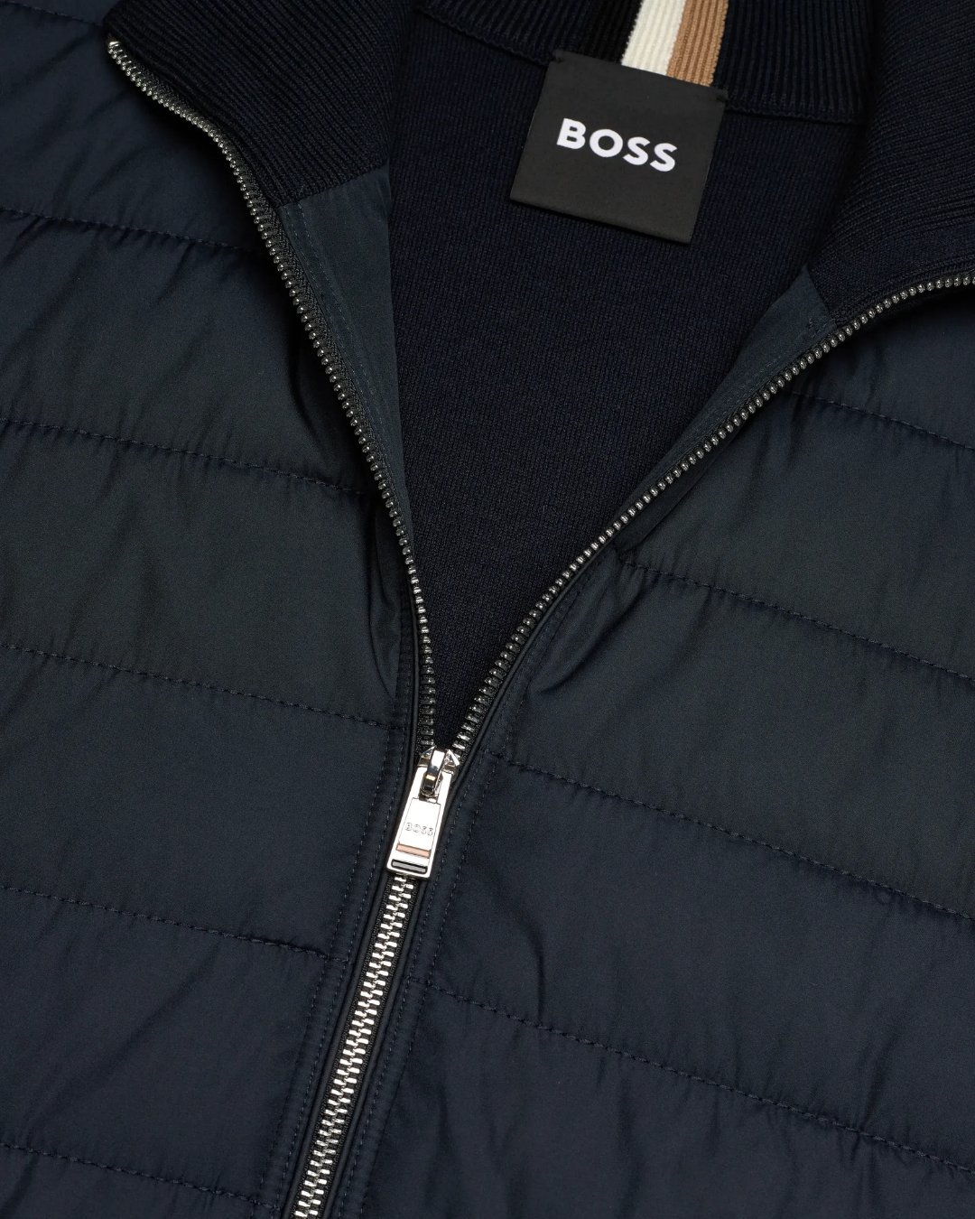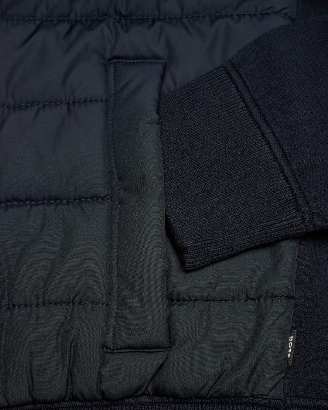 Denne jakken fra BOSS er designet for å gi deg ekstra varme og komfort, samtidig som den enkelt kan styles som et lag under eller over andre plagg. Den er laget i en myk ull- og bomullsblanding med en kontrastfylt, vattert front som tilfører både stil og funksjonalitet. Ribbestrikkede kanter gir en koselig og tett passform.