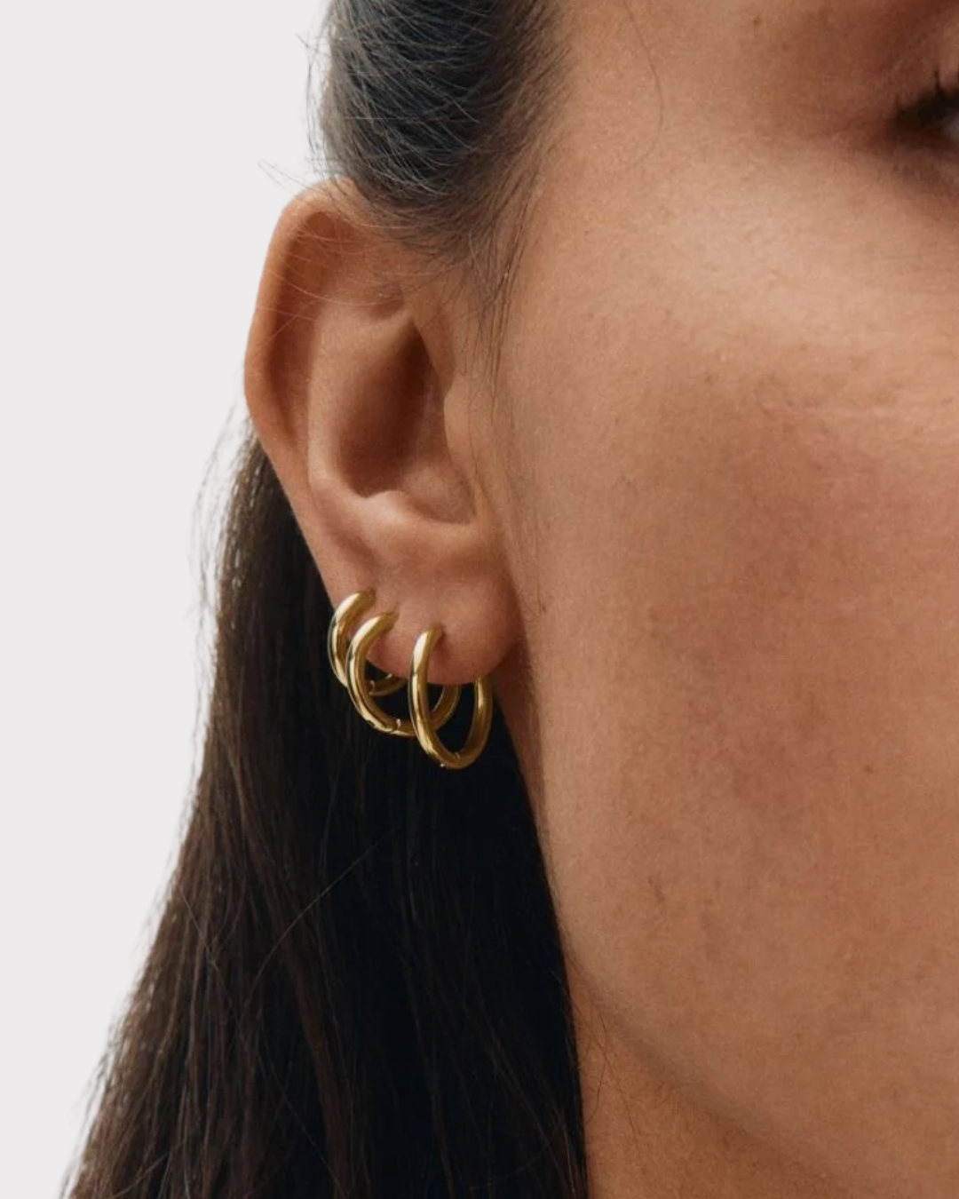 Triple Pair Hoops Gold er et elegant og tidløst tilbehør som vil løfte ethvert antrekk. Disse øredobbene er perfekte for å tilføre et snev av glamour til din stil.