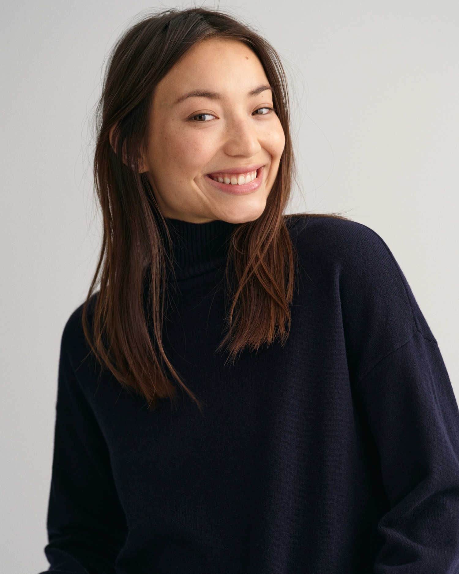 Fine ribbestrikkdetaljer og liten brodert GANT logo på ermet.